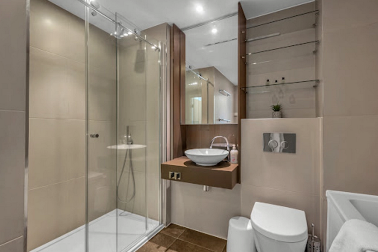 This one bedroom apartment features a large double bedroom with built-in storage, modern bathroom, a living area with TV and a spacious fully equipped, open plan kitchen including an oven, hob, microwave, dishwasher and fridge.